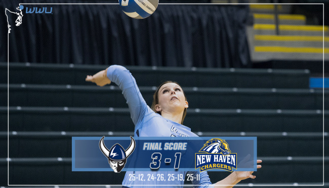 The 12th-ranked Western Washington University volleyball team improved to 2-1 on the season with a 3-1 victory over New Haven in the first of two Saturday matches during the final day of The Terrace Hotel Classic at Jenkins Field House.