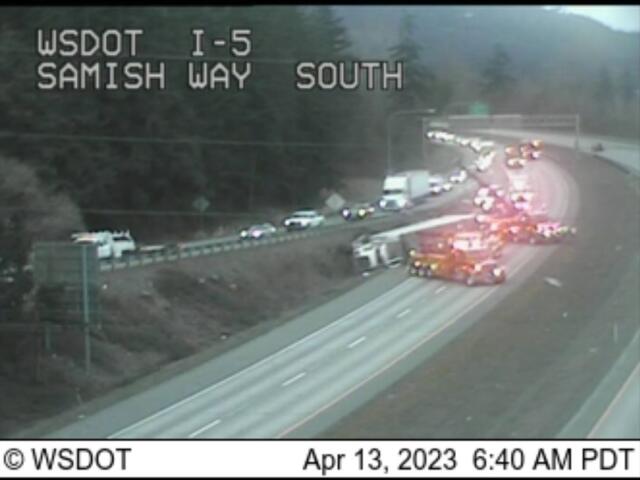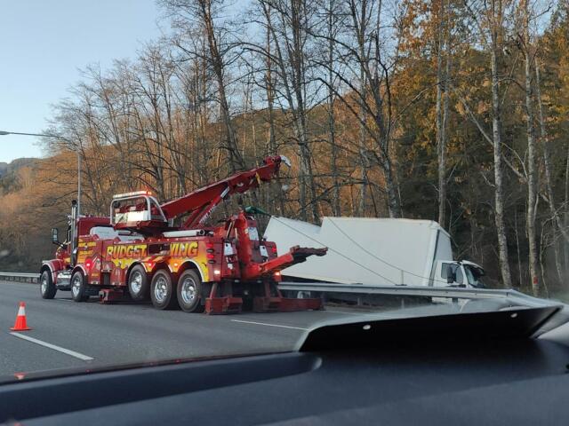 Traffic was backed up to Alger on Wednesday, April 12th, as crews closed off the right lane and hoisted the truck back onto the road.