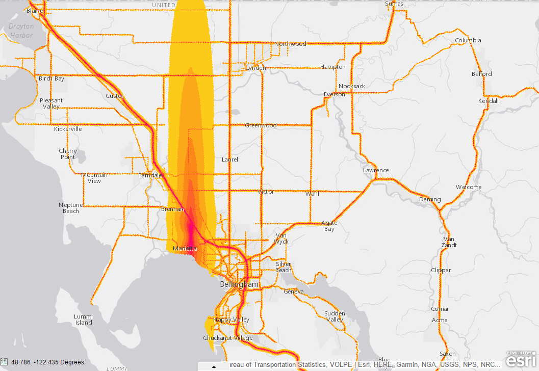 The loudest spot in Whatcom County is a cone just around the airport and it stretches north right to the border.
